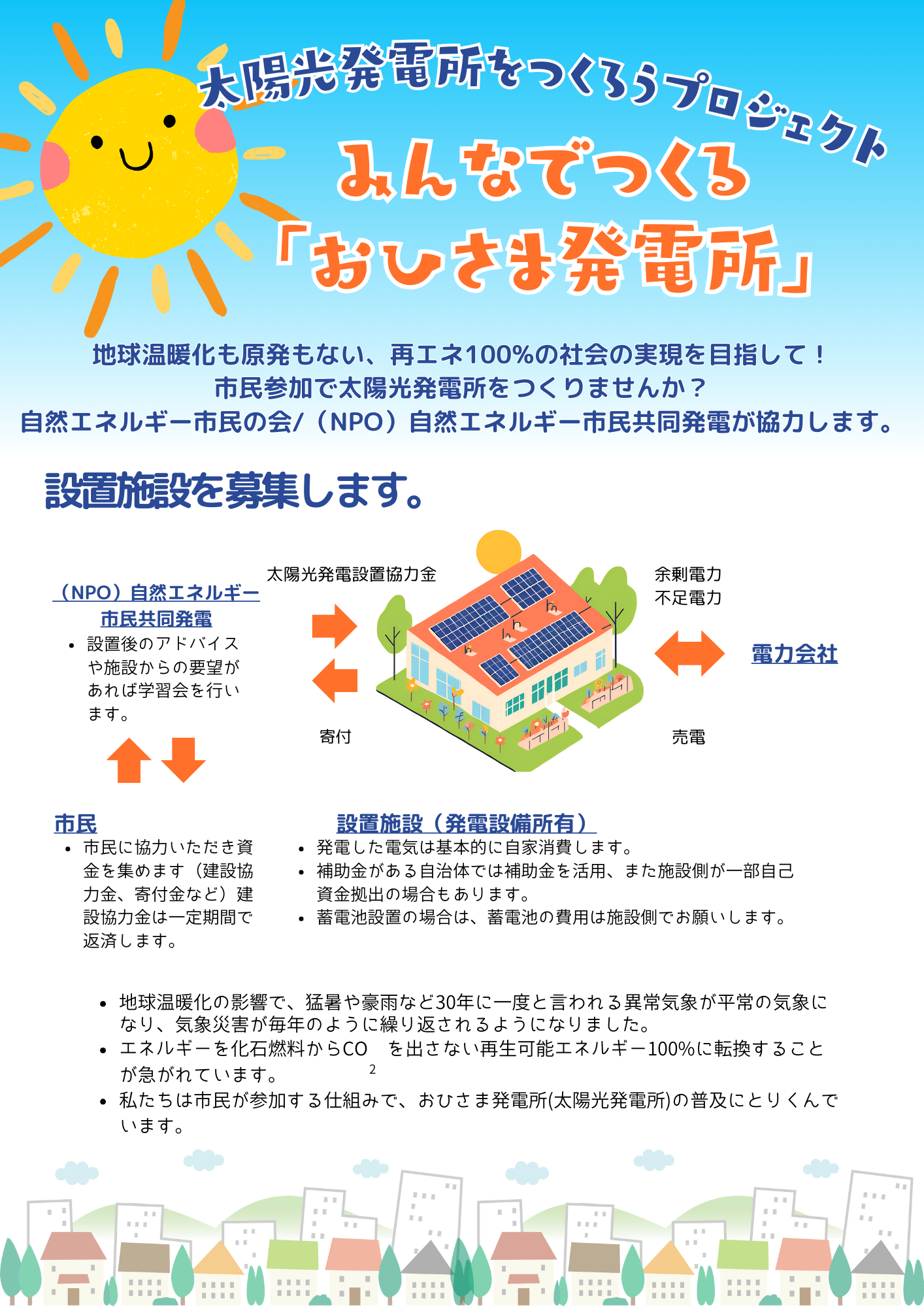 ・私たちは市民が参加する仕組みで、おひさま発電所(太陽光発電所)の普及にとりくんでいます。